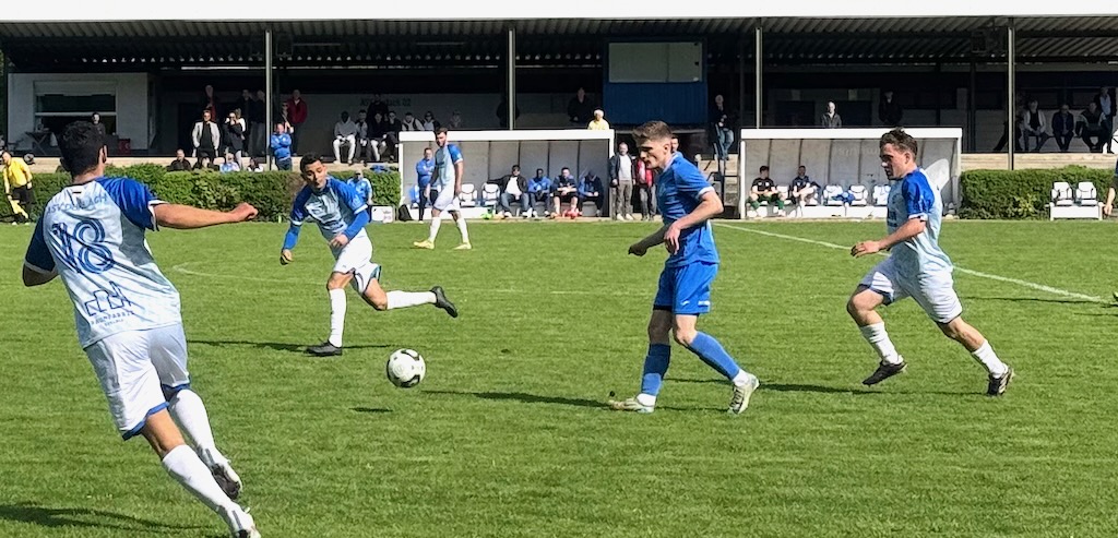 (6.4.2026) Zum Abschluss der englischen Osterwoche empfing der ASV Durlach im Turmbergstadion mit dem 1. FC Ersingen ein Team, das zuletzt zweimal hintereinander gewonnen und am Gründonnerstag den Tabellenführer aus Aue mit 4:3 bezwungen hatte. Kein leichtes Unterfangen für den ASV also, um nach dem Sieg gegen Büchig erneut in die Punkte zu kommen. Das Spiel begann vielversprechend: schon nach sieben Minuten konnte Kennedy Paranagua Marques nach einem langen Diagonalball von halbrechts alleine auf FCE-Torhüter Dustin Dusan Ajder zulaufen und mit einem Flachschuss den ASV in Führung bringen. In der Folgezeit hinterließen beide Mannschaften den Eindruck, als ob ihnen das dritte Spiel innerhalb einer Woche doch einiges körperlich abverlangt hätte. Das Tempo wurde verschleppt, Pässe waren unpräzise und Torchancen ergaben sich kaum. Und doch fiel in der 27. Minute der überraschende Ausgleich, als die ASV-Abwehr auf der rechten Defensivseite nicht entschlossen genug eingriff und Jonas Striegel aus kurzer Entfernung das Ausgleichstor ermöglichte. Zu diesem Zeitpunkt war noch nicht absehbar, dass das Spiel im zweiten Durchgang erheblich an Fahrt aufnehmen würde. Hier wussten nämlich nach zunächst verteiltem Spiel die Ersinger das erste Ausrufezeichen zu setzen. Nach eigenem Eckball lief der ASV in einen Konter, bei dem Ersingens Kapitän Paul Vielsack erneut Jonas Striegel fand, der seine Farben mit 2:1 in Führung brachte (65.). Wäre nicht kurz darauf der ideale Konterspieler Vielsack, der trotz harter Bedrängnis noch zum Schuss kam, am glänzend reagierenden ASV-Torhüter Bruno Gräßner Herranz gescheitert, hätte es wohl eine Heimniederlage gegeben. So aber blieb das Spiel offen und der ASV stemmte sich mit allem, was er hatte, gegen ein negatives Ergebnis – und drehte schließlich die Begegnung. Keine zehn Minuten nach dem 1:2 verwertete Valentino Vujinovic eine flache Rückgabe von der Grundlinie aus kurzer Entfernung zum Ausgleich (75.). Nun warf der ASV alles nach vorne und wollte das Spiel gewinnen, während der Gegner seinerseits mithilfe von Kontern den Lucky Punch setzen wollte. Doch dieser gelang dem ASV in der dritten Minute der Nachspielzeit: Valentino Vujinovic jagte einen Querpass von der Strafraumgrenze mit voller Wucht ins rechte Tordreieck (90. +3) und brachte Mannschaft und Fans zum Jubeln. Zwei weitere Minuten später kam zum Jubel auch die Erleichterung hinzu, nachdem der ASV einen letzten Eckball der Ersinger, bei dem auch Torwart Dustin Dusan Ajder im Durlacher Fünfmeterraum aufgetaucht war, erfolgreich verteidigt hatte und der Schlusspfiff ertönte.