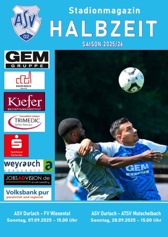 StadionmagazinHALBZEITSAISON 2025/26ASV Durlach - FV WiesentalSonntag, 07.09.2025 - 15.00 UhrASV Durlach - ATSV MutschelbachSonntag, 28.09.2025 - 15.00 Uhr