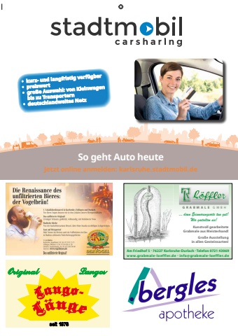 Jetzt online anmelden: karlsruhe.stadtmobil.deSo geht Auto heute%u2022 kurz- und langfristig verf%u00fcgbar%u2022 preiswert%u2022 gro%u00dfe Auswahl: von Kleinwagenbis zu Transportern%u2022 deutschlandweites NetzAm Friedhof 5 %u2022 76227 Karlsruhe-Durlach %u2022 Telefon 0721 43069 www.grabmale-loeffler.de %u2022 info@grabmale-loeffler.deGRABMALE GMBHKunstvoll gearbeitete Grabmale aus Meisterhand!Gro%u00dfe Ausstellung in allen Gesteinsarten!... denn Erinnerungsorte tun gut!Wir gestalten sie!
