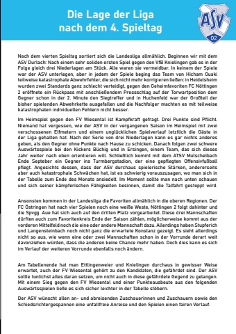 Die Lage der Liga nach dem 4. SpieltagNach dem vierten Spieltag sortiert sich die Landesliga allm%u00e4hlich. Beginnen wir mit dem ASV Durlach: Nach einem sehr soliden ersten Spiel gegen den VfB Knielingen gab es in der Folge gleich drei Niederlagen am St%u00fcck. Alle waren sie vermeidbar. In keinem der Spiele war der ASV unterlegen, aber in jedem der Spiele beging das Team von Hicham Ouaki teilweise katastrophale Abwehrfehler, die sich nicht mehr korrigieren lie%u00dfen: in Heidelsheim wurden zwei Standards ganz schlecht verteidigt, gegen den Geheimfavoriten FC N%u00f6ttingen 2 er%u00f6ffnete ein R%u00fcckpass mit anschlie%u00dfendem Pressschlag auf der Torwartposition dem Gegner schon in der 2. Minute den Siegtreffer und in Huchenfeld war der Gro%u00dfteil der bisher spielenden Abwehrkette ausgefallen und die Nachfolger machten es mit teilweise katastrophalen individuellen Fehlern nicht besser. Im Heimspiel gegen den FV Wiesental ist Kampfkraft gefragt. Drei Punkte sind Pflicht. Niemand hat vergessen, wie der ASV in der vergangenen Saison im Heimspiel mit zwei verschossenen Elfmetern und einem ungl%u00fccklichen Spielverlauf letztlich die G%u00e4ste in der Liga gehalten hat. Nach der Serie von drei Niederlagen kann es gar nichts anderes geben, als den Gegner ohne Punkte nach Hause zu schicken. Danach folgen zwei schwere Ausw%u00e4rtsspiele bei den Kickers B%u00fcchig und in Ersingen, einem Team, das sich dieses Jahr weiter nach oben orientieren will. Schlie%u00dflich kommt mit dem ATSV Mutschelbach Ende Septeber ein Gegner ins Turmbergstadion, der eine gepflegten Offensivfu%u00dfball pflegt. Angesichts dessen, dass der ASV durchaus spielerische St%u00e4rken, andererseits aber auch katastrophale Schw%u00e4chen hat, ist es schwierig vorauszusagen, wo man sich in der Tabelle zum Ende des Monats ansiedelt. Im Moment sollte man nach unten schauen und sich seiner k%u00e4mpferischen F%u00e4higkeiten besinnen, damit die Talfahrt gestoppt wird.Ansonsten kommen in der Landesliga die Favoriten allm%u00e4hlich in die oberen Regionen. Der FC %u00d6stringen hat nach vier Spielen noch eine wei%u00dfe Weste, N%u00f6ttingen 2 folgt dahinter und die Spvgg. Aue hat sich auch auf den dritten Platz vorgearbeitet. Diese drei Mannschaften d%u00fcrften auch zum Favoritenkreis Ende der Saison z%u00e4hlen, m%u00f6glicherweise kommt aus der vorderen Mittelfeld noch die eine oder andere Mannschaft dazu. Allerdings haben Stupferich und Langensteinbach noch nicht ganz die erwartete Konstanz gezeigt. Es sieht allerdings nicht so aus, wie wenn eine oder zwei Mannschaften schon in der Vorrunde derart weit davonziehen w%u00fcrden, dass die anderen keine Chance mehr haben. Doch dies kann es sich im Verlauf der weiteren Vorrunde ebenfalls noch %u00e4ndern.Am Tabellenende hat man Ettlingenweier und Knielingen durchaus in gewisser Weise erwartet, auch der FV Wiesental geh%u00f6rt zu den Kandidaten, die gef%u00e4hrdet sind. Der ASV sollte tunlichst alles daran setzen, um nicht auch in diese gef%u00e4hrdete Gegend zu gelangen. Mit einem Sieg gegen den FV Wiesental und einer Punkteausbeute aus den folgenden Ausw%u00e4rtsspielen lie%u00dfe es sich sicher leichter in der Tabelle st%u00f6bern.Der ASV w%u00fcnscht allen an- und abreisenden Zuschauerinnen und Zuschauern sowie den Schiedsrichtergespannen eine unfallfreie Anreise und den Spielen einen fairen Verlauf.